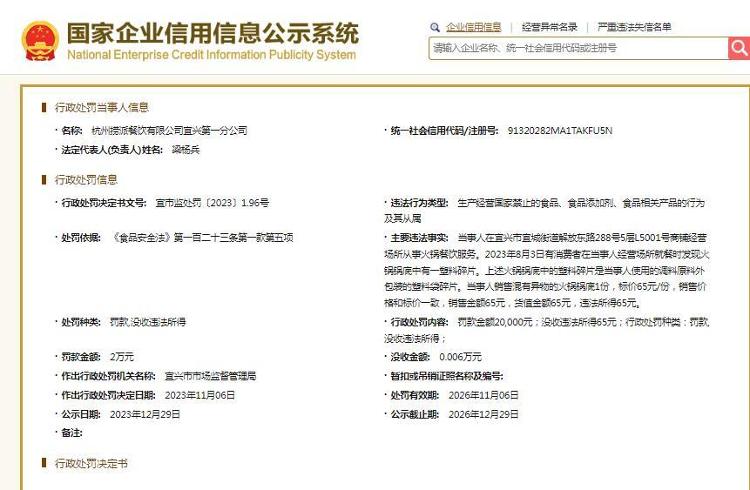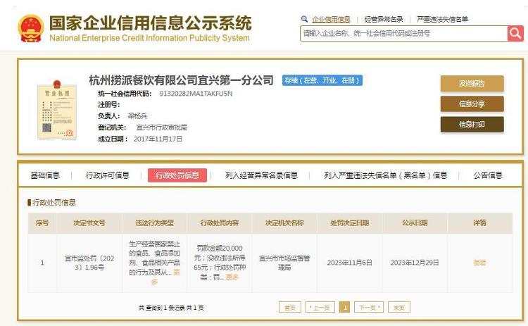 中新网1月8日电国家企业信用信息公示系统网站近日公示的一则行政处罚决定书显示富灯网 ,2023年11月6日,杭州捞派餐饮有限公司宜兴第一分公司,被宜兴市市场监督管理局罚款2万元、没收违法所得65元。