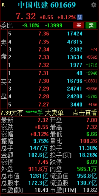 09:54 中国电建开盘不足30分钟成交额突破100亿元,势创个股历史天量;现涨超8%,此前连续3日一字涨停。