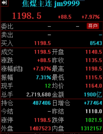 14:24 焦煤期货主力合约触及涨停,涨幅7.97%。