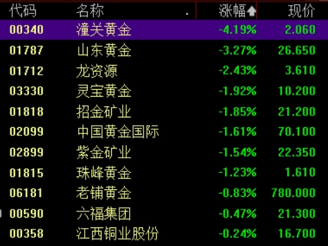潼关黄金跌超4%,山东黄金跌超3%,龙资源、灵宝黄金、招金矿业等跌幅居前。