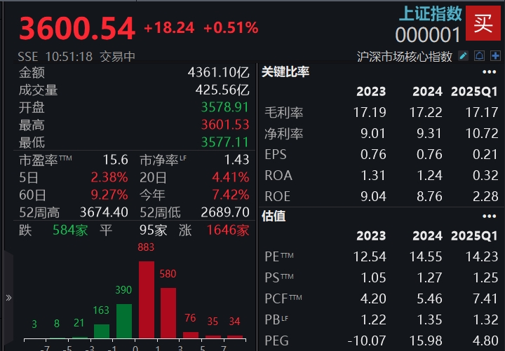 截至收盘,上证指数涨0.65%,站上3600点。深证成指涨1.21%,创业板指涨1.5%。