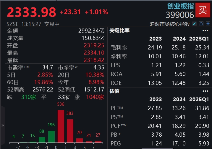 收盘|创业板指涨1.76% 全市场超3500只个股上涨盘面上,CPO概念全天强势,军工装备板块活跃,医药、消费电子、钢铁板块涨幅居前;贵金属板块低迷,地产、银行、燃气、电力股跌幅居前。