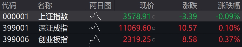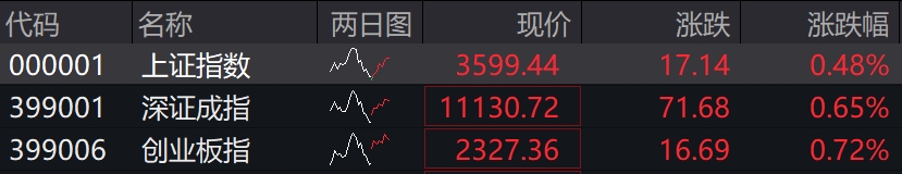 沪指报3599.44点,涨0.48%,深成指报11130.72点,涨0.65%,创业板指报2327.36点,涨0.72%。