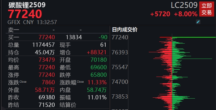 13:32 碳酸锂主力合约触及涨停,涨幅8.00%,报77240元/吨。