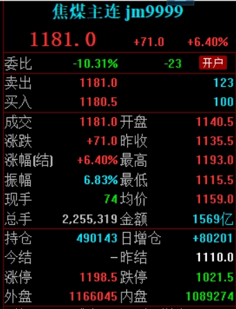 10:40 焦煤主力合约日内大涨超6%,现报1181.00元/吨。