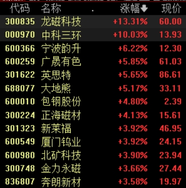 09:43 稀土永磁概念股盘初拉升,龙磁科技涨超13%,中科三环涨停,宁波韵升、广晟有色、厦门钨业等纷纷上扬。