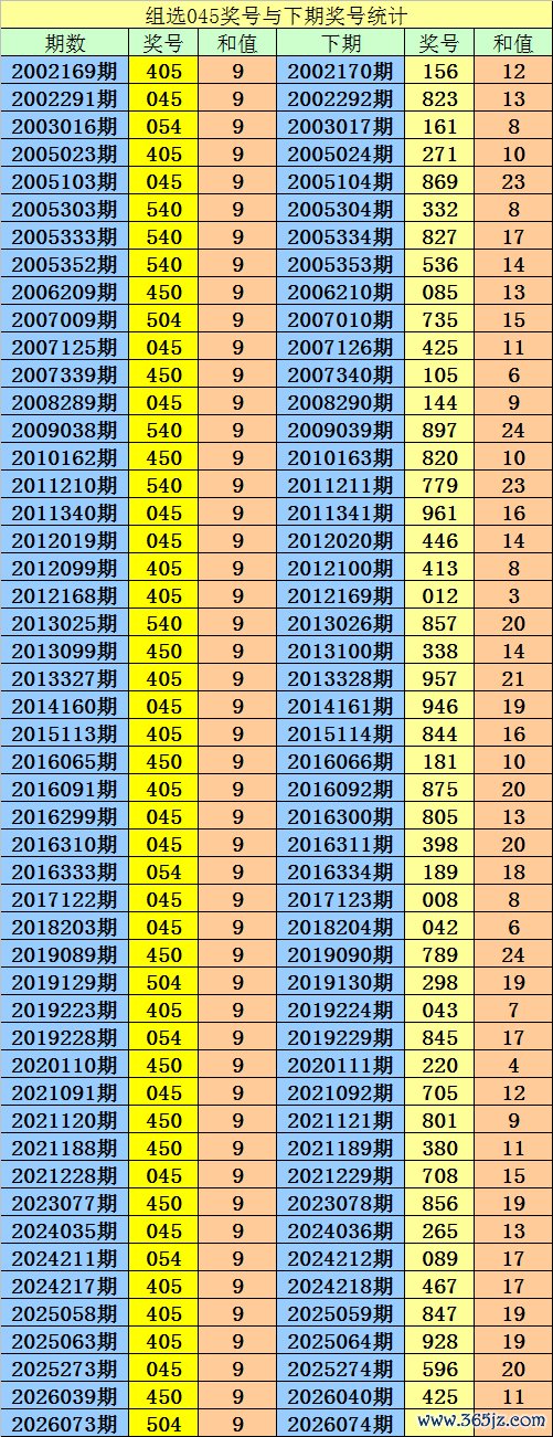 第2026073期3D奖号组选为:045,历史上该号码组选出现50次,下期号码分别为:156、823、161、271、869、332、827、536、085、735、425、105、144、897、820、779、961、446、413、012、857、338、957、946、844、181、875、805、398、189、008、042、789、298、043、845、220、705、801、380、708、856、265、089、467、847、928、596、425。