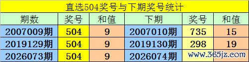 第2026073期3D奖号为:504,历史上该号码直选开出3次,下期号码分别为:735、298。