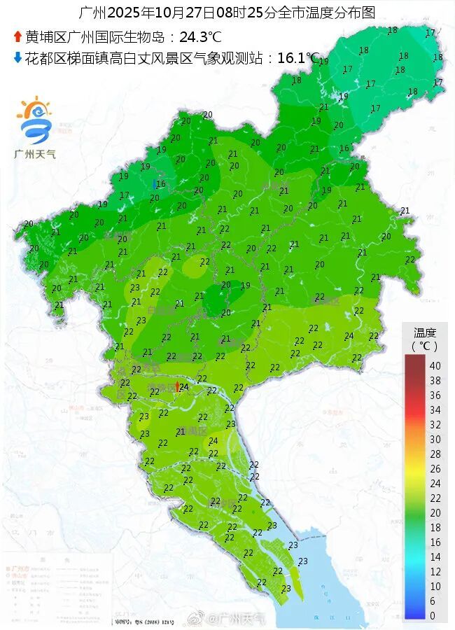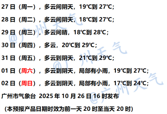 10月27日~28日,南部沿海市县多云间阴天,局部有零星小雨,其余市县多云间晴天。最低气温:粤北市县16~18℃,南部沿海市县21~23℃,其余市县18~20℃。